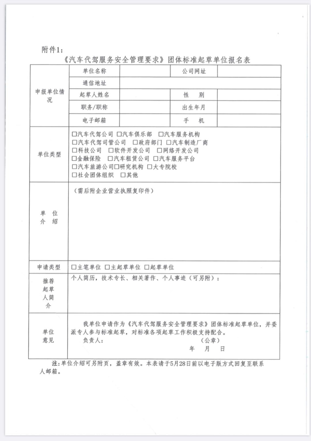 导语:为规范汽车代驾行业安全管理,提高汽车代驾服务安全指数,降低代驾行业道路交通和车辆相关安全事故风险,提升消费者满意度,保护消费者合法权益,促进汽车代驾行业的升级发展,中国汽车流通协会与中国道路交通安全协会联合制定《汽车代驾服务安全管理要求》团体标准,为使此标准具有广泛代表性、科学性和适用性,现公开向全行业征集起草单位,通知如下: