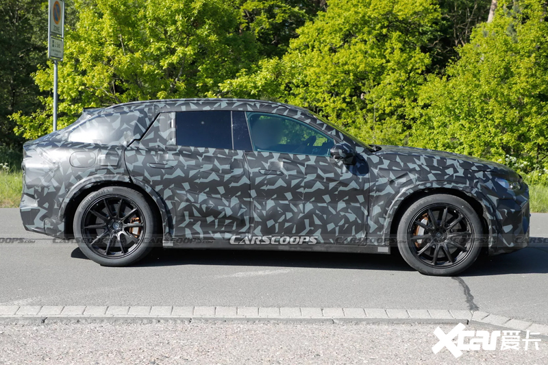 从外观上看,这款SUV车身高度低于普通梅赛德斯跨界车,更像大型跨界车,类似法拉利 Purosangue。虽然车头大部分设计被伪装和车身覆层隐藏,但能看出大尺寸格栅轮廓和前大灯基本形状。侧面的黑色轮毂、橙色刹车卡钳以及硕大的高性能轮胎十分吸睛,轮胎尺寸前轮285/40 ZR22,后轮325/35 ZR22,比莲花Eletre S的轮胎还大。车尾部分,后窗和尾门形状有点像起亚EV6,不过原型车尾部用了假冒零件,量产时肯定会大幅改动。